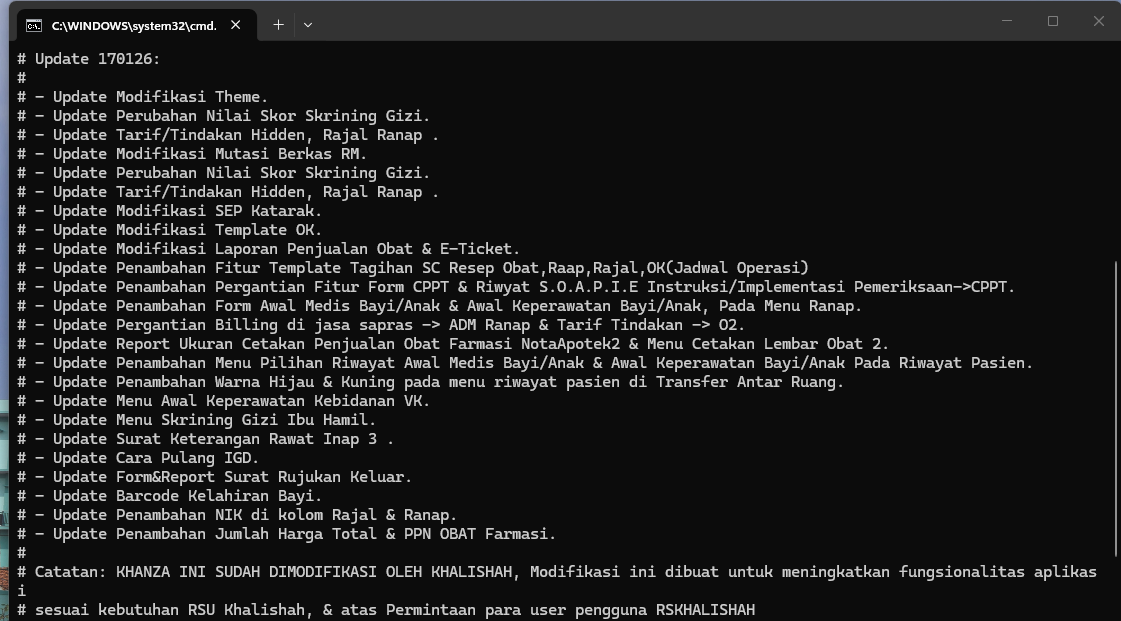 KHANZA Modifikasi ini dibuat untuk meningkatkan fungsionalitas aplikasi sesuai kebutuhan RSU Khalishah. dan Modifikasi menu lainya..
